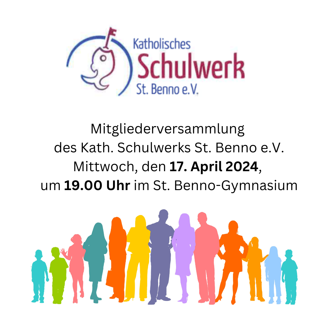 Die Mitgliederversammlung findet am Mittwoch, dem 17. April 2024, um 19:00 Uhr in der Aula des St. Benno-Gymnasiums statt.