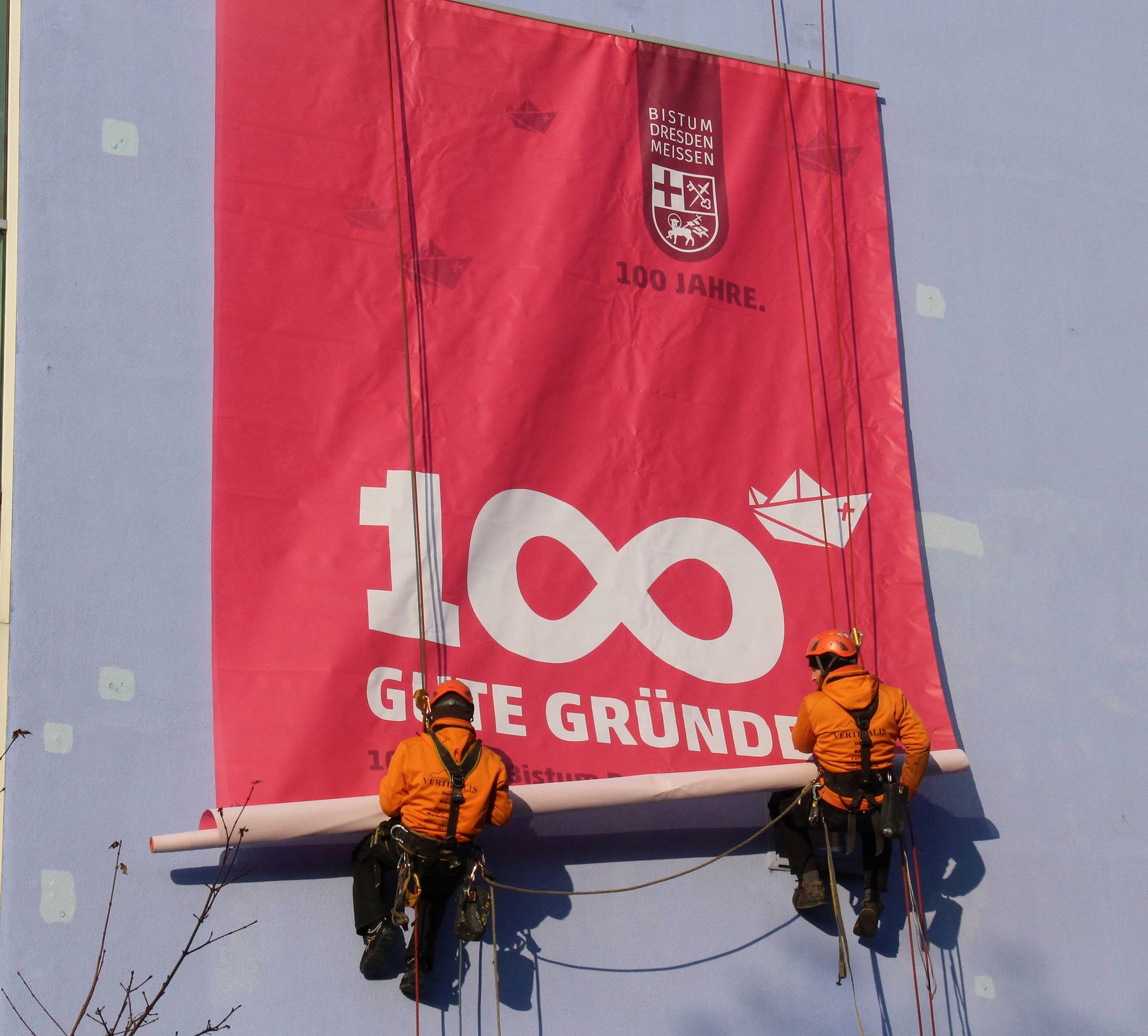 Mit einem Banner an der Fassade unserer Schule wurde heute ein sichtaberes Zeichen für das Festjahr zu 100 Jahre Wiedererrichtung des Bistums Dresden-Meissen 2021 entrollt. Im Jahr 1921 erhob Papst Benedikt XV. die Apostolische Präfektur Meißen zum Bistum Meißen, unserer heutigen Diözese Dresden-Meißen.