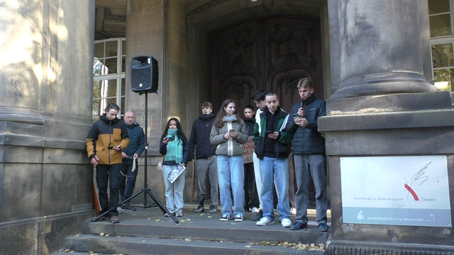 Unter dem Thema „Die Gleichschaltung der Künste 1933“ zeigten Schulklassen, u.a. vom Benno-Gymnasium und Jugendgruppen aus Dresden, wie schnell nach der Machtübernahme durch die Nationalsozialisten renommierte Stätten der Kunst und Kultur in Dresden an die Ideologie angepasst und in ihren Dienst gestellt wurden. Viele Künstler wurden verfolgt. Die Jugendlichen hatten dazu an den Stationen des Weges verschiedene Anspiele und Informationen vorbereitet. Die Stationen befanden sich an der Kreuzkirche, dem Wettiner Platz, dem Staatsschauspiel, der Semperoper, dem Rathaus, der Hochschule für Bildende Künste und der Dresden Synagoge an der Fiedlerstraße.
