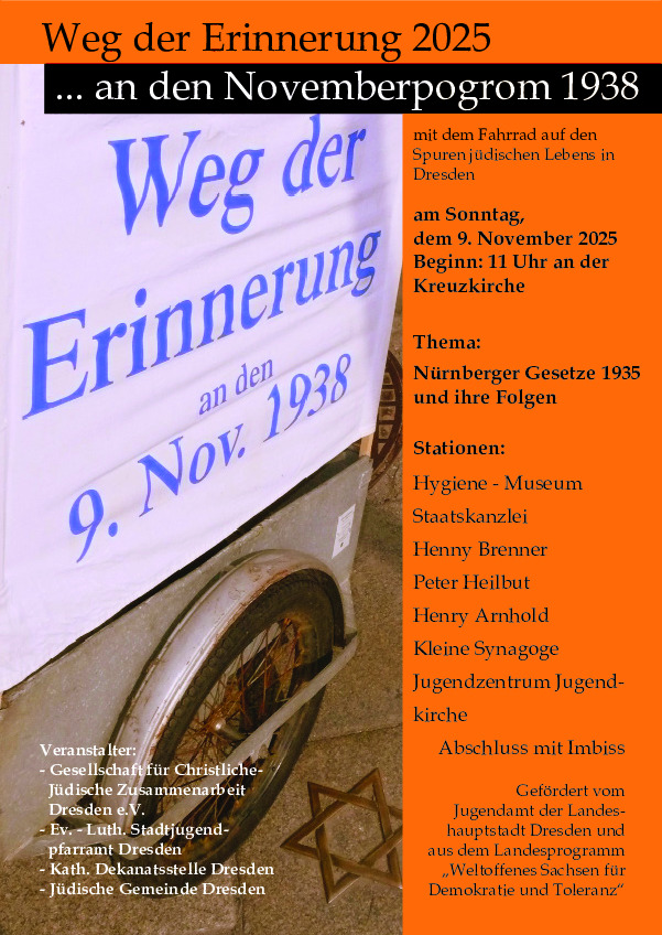 Am Sonntag, 9.11.2025 findet der „Weg der Erinnerung“ in Dresden statt, der seit mehr als 30 Jahren von der Gesellschaft für christlich-jüdische Zusammenarbeit mit ihren Partnern vorbereitet und durchgeführt wird. Im Gedenken an die Novemberpogrome führt der Weg per Fahrrad zu Stätten jüdischen Lebens und Leidens in Dresden. Jugendgruppen aus Gemeinden und Schulklassen bereiten dazu Stationen vor.
