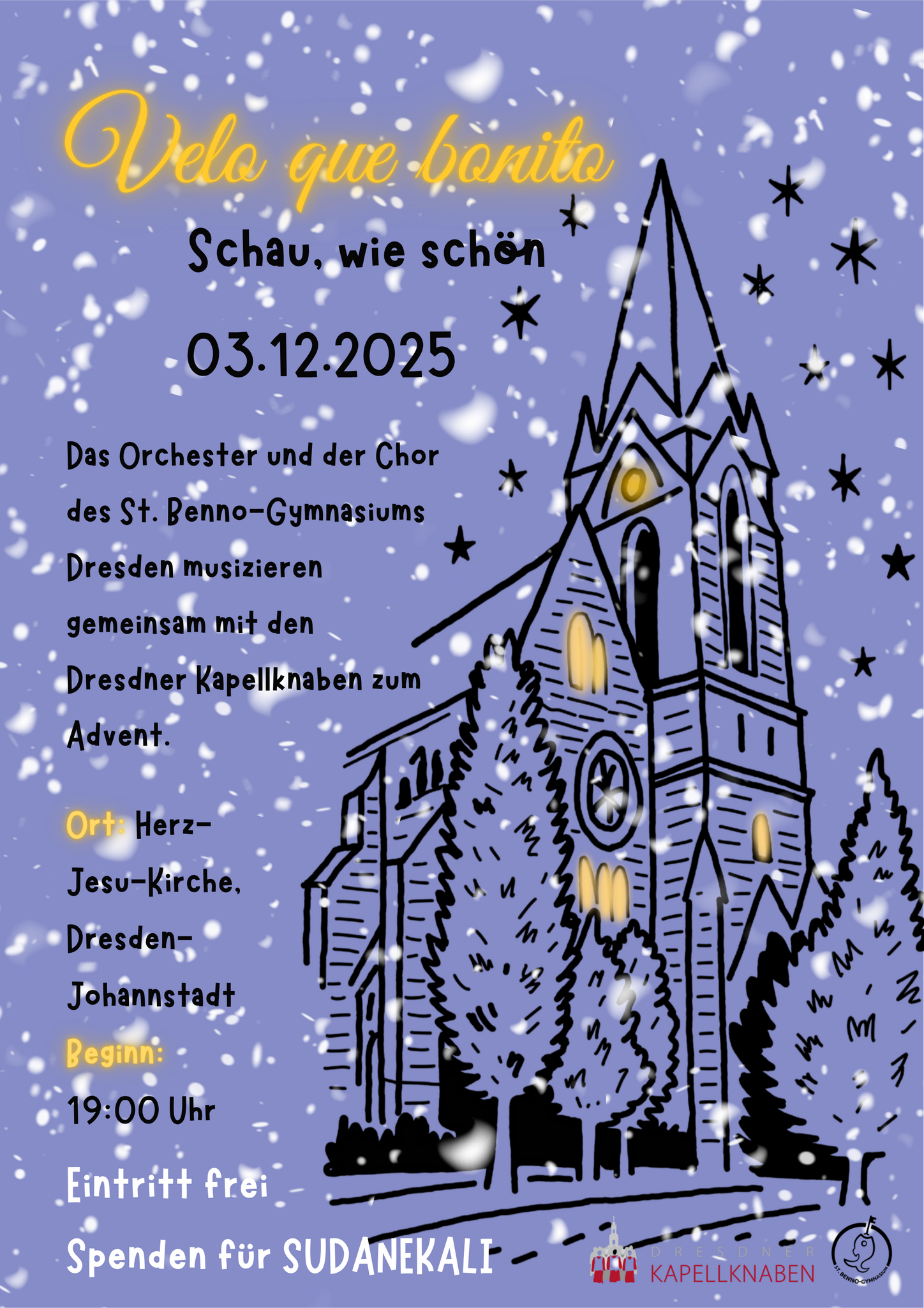Adventskonzert gemeinsam mit den Kapellknaben19:00 Uhr in der Herz-Jesu-Kirche Das Orchester und der Chor des St. Benno-Gymnasiums musizieren gemeinsam mit den Dresdner Kapellknaben. Eintritt frei - Spenden für Sudanecali werden erbeten.