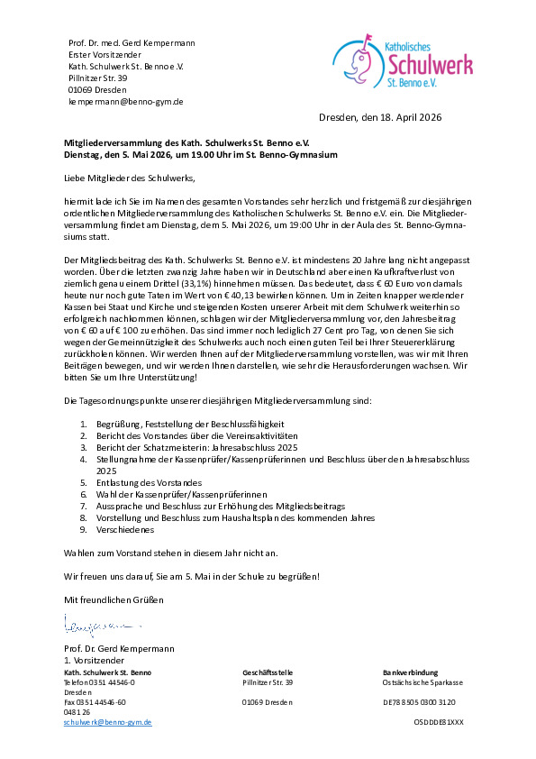 hiermit laden wir Sie im Namen des gesamten Vorstandes sehr herzlich und fristgemäß zur diesjährigen ordentlichen Mitgliederversammlung des Katholischen Schulwerks St. Benno e.V. ein. Die Mitglieder versammlung findet am Dienstag, dem 5. Mai 2026, um 19:00 Uhr in der Aula des St. Benno-Gymnasiums statt.